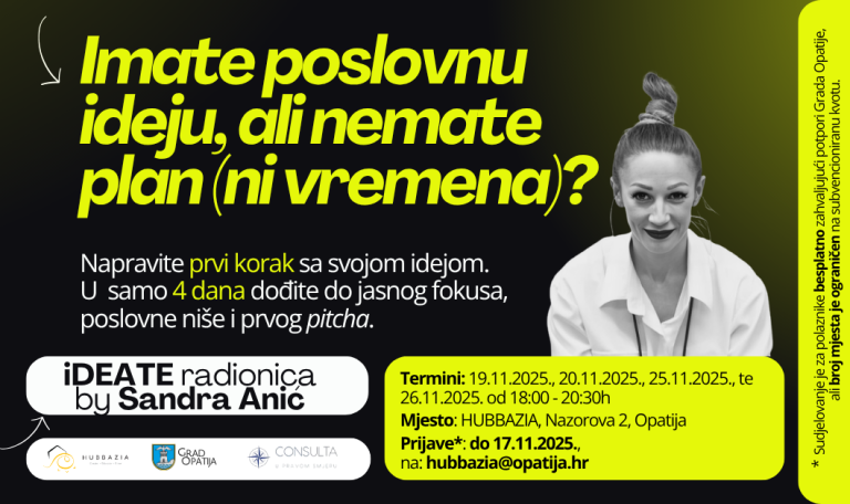 Prijavite se na iDEATE: besplatne radionice poslovnog usmjeravanja i prve validacije vaše poduzetničke ideje (19.–26.11., Opatija)