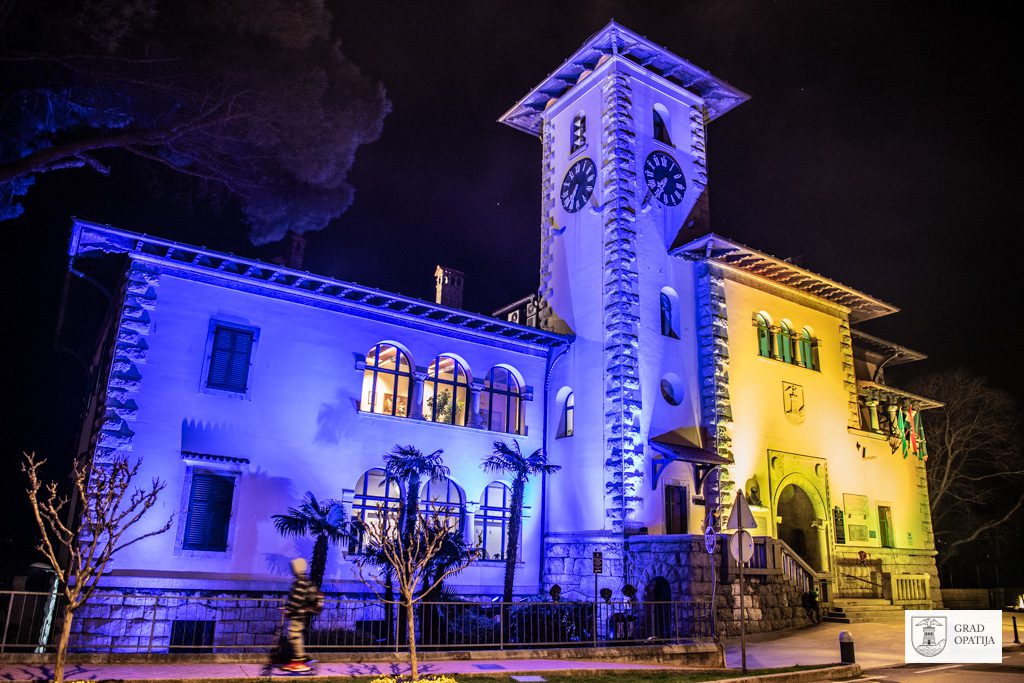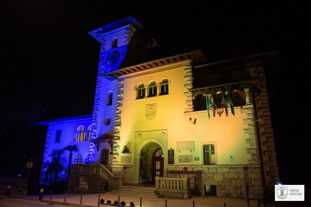 Zgrada gradske uprave Grada Opatije sinoć je svijetlila u bojama ukrajinske zastave, u znak potpore narodu Ukrajine i želje za mirnim rješavanjem sukoba.