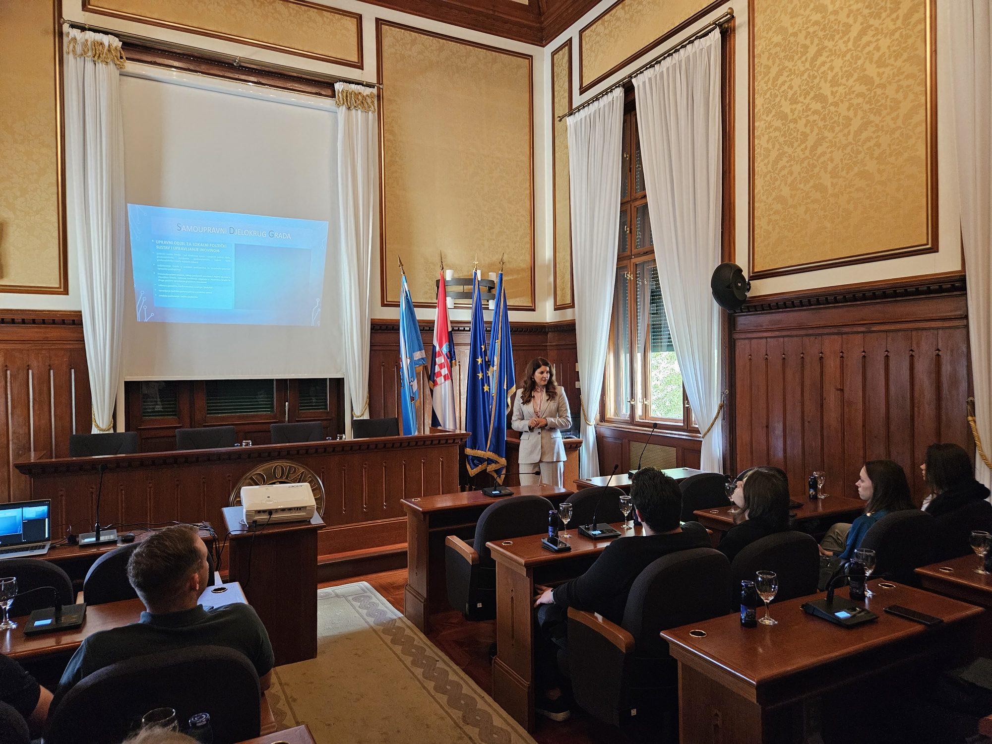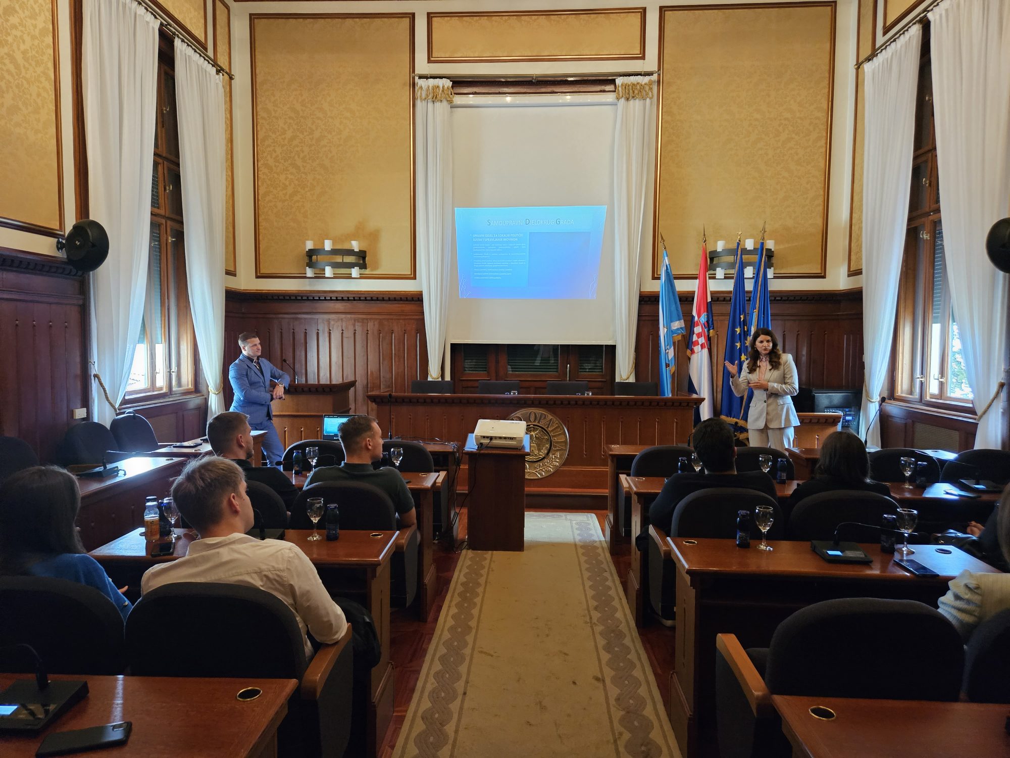 Predavanje o posebnostima rada u jedinici lokalne samouprave te svakodnevnim izazovima s kojima se službe susreću, danas su u Gradskoj vijećnici održali pročelnik Upravnog odjela za komunalni sustav, prostorno planiranje i zaštitu okoliša Filip Vlah i voditeljica Odsjeka za utvrđivanje i naplatu prihoda Marija Randić.